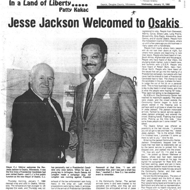 ⭐ Did you know Rev. Jesse Jackson was the first presidential candidate to visit Osakis, MN in 1988? ⭐ On Thursday, January 7, 1988, in a