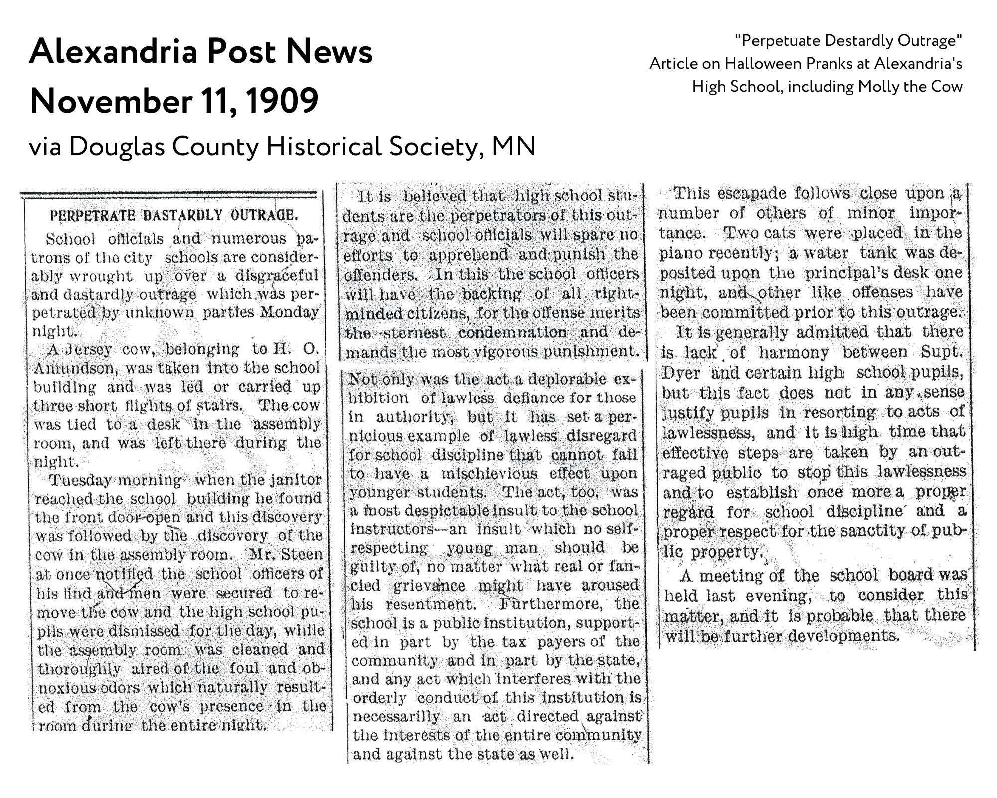 Mr. Steen, the school’s janitor, arrived the next morning to discover the front door open and Molly upstairs. School officers quickly cancelled classes for the day “while the assembly room was cleaned and thoroughly aired of the foul and obnoxious odors which naturally resulted from the cow’s presence in the room during the entire night.” (Alexandria Post News, November 11, 1909)