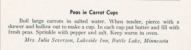 “Boil large carrots in salted water. When tender, pierce with a skewer and hollow out to make a cup. In each cup put butter and fill with fresh peas. Sprinkle with pepper and salt. Keep warm in oven.” (from Mrs. Julia Severson, Lakeside Inn, Battle Lake, Minnesota)