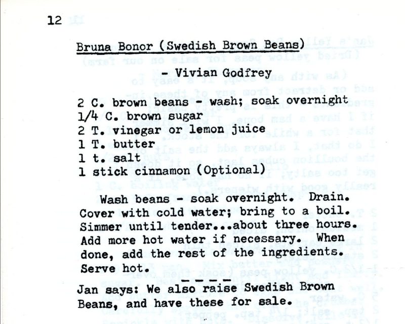 Wash beans–soak overnight. Drain. Cover with cold water; bring to a boil. Simmer until tender…about three hours. Add more hot water if necessary. When done, add the rest of the ingredients. Serve hot. (from Vivian Godfrey)