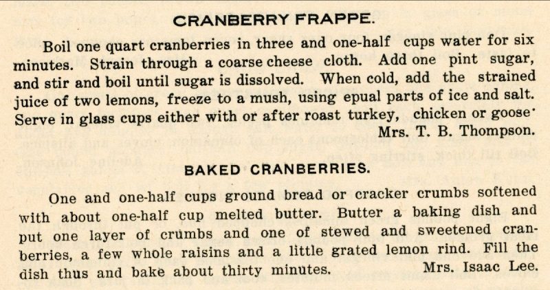 “Boil one quart cranberries in three and one-half cups water for six minutes. Strain through a coarse cheese cloth. Add one pint sugar, and stir well and boil until sugar is dissolved. When cold, add the strained juice of two lemons, freeze to a mush, using [equal] parts of ice and salt. Serve in glass cups either with or after roast turkey, chicken or goose” (from Mrs. T.B. Thompson)
