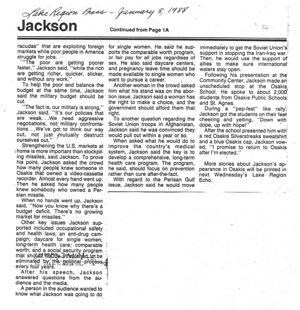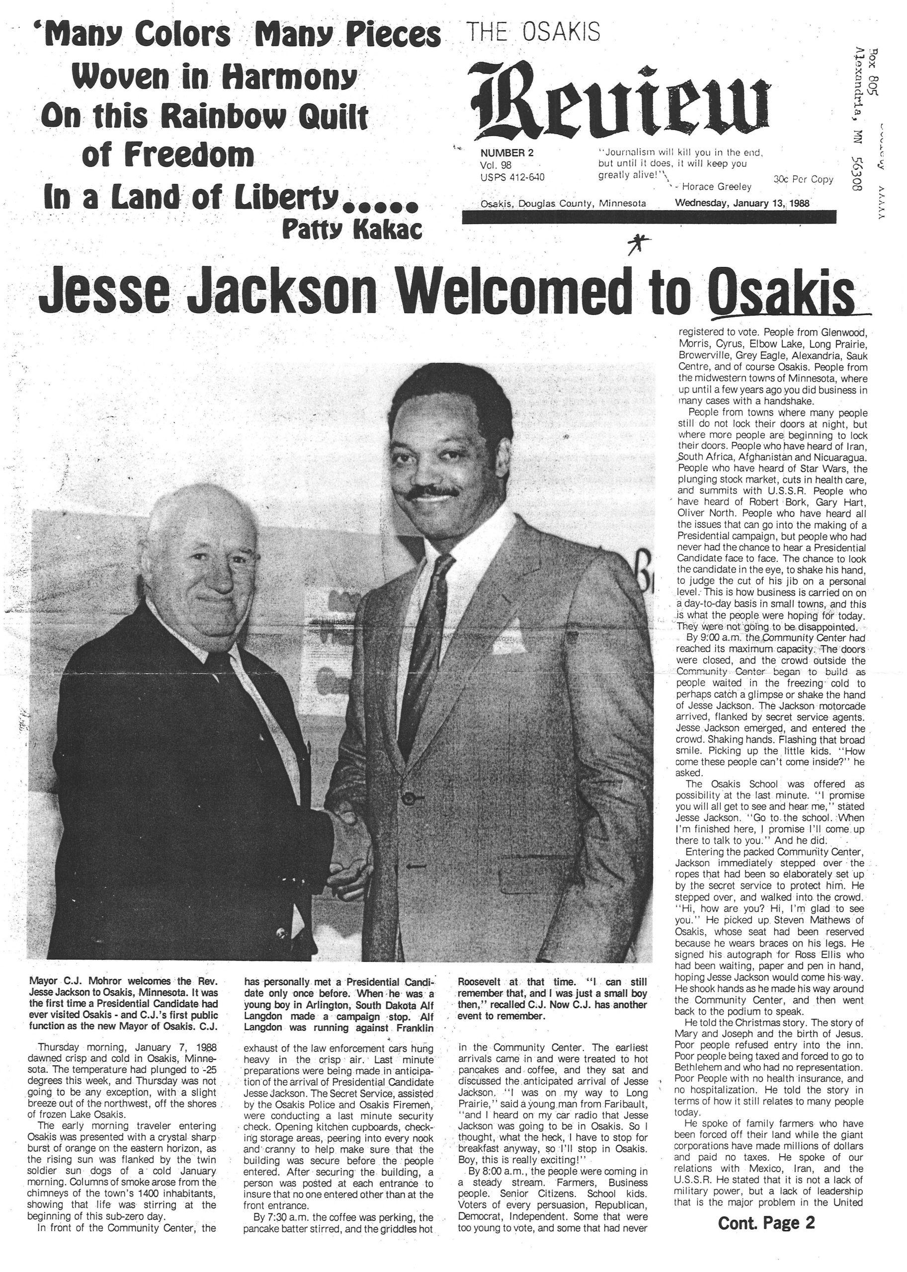 On Thursday, January 7, 1988, in a week that was noted for remarkably cold temps, Jesse Jackson made local history in Douglas (and Todd) Counties as the first presidential candidate to visit and speak in Osakis, MN.