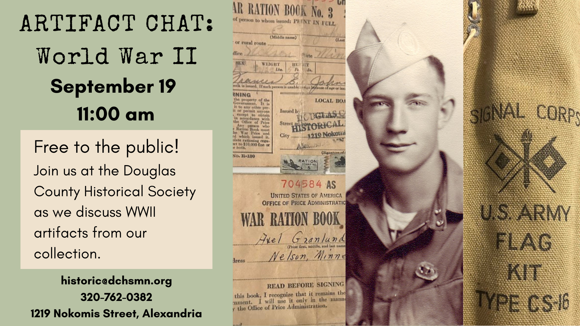 Free to the public! Join us at the Douglas County Historical Society as we discuss WWII artifacts from our collection. September 19, 2025 11:00 am historic@dchsmn.org 320-762-0382 1219 Nokomis Street, Alexandria, 56308